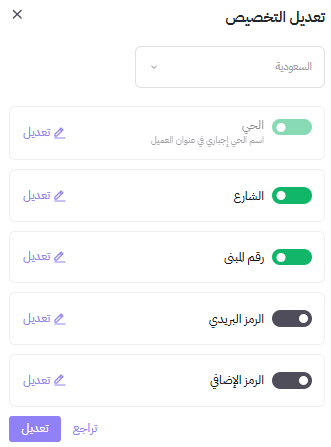 بعد الضغط على تخصيص الدولة ومن ثم تعديل بإمكانك التحكم في بيانات نموذج إضافة العنوان للعميل النهائي بناءً على الدولة.